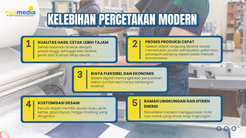 Semua kebutuhan cetak dapat diakomodasi dengan mudah oleh percetakan modern. Hal ini membuat penulis merasa lebih terlibat dalam proses kreatif penerbitan bukunya sendiri.