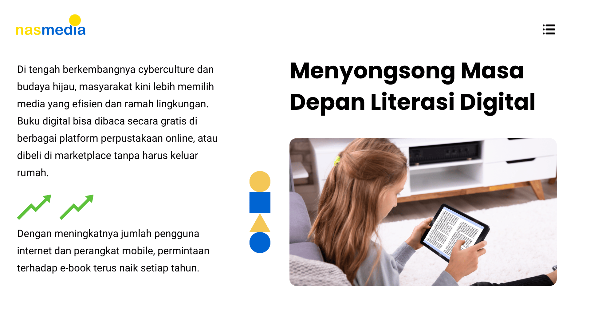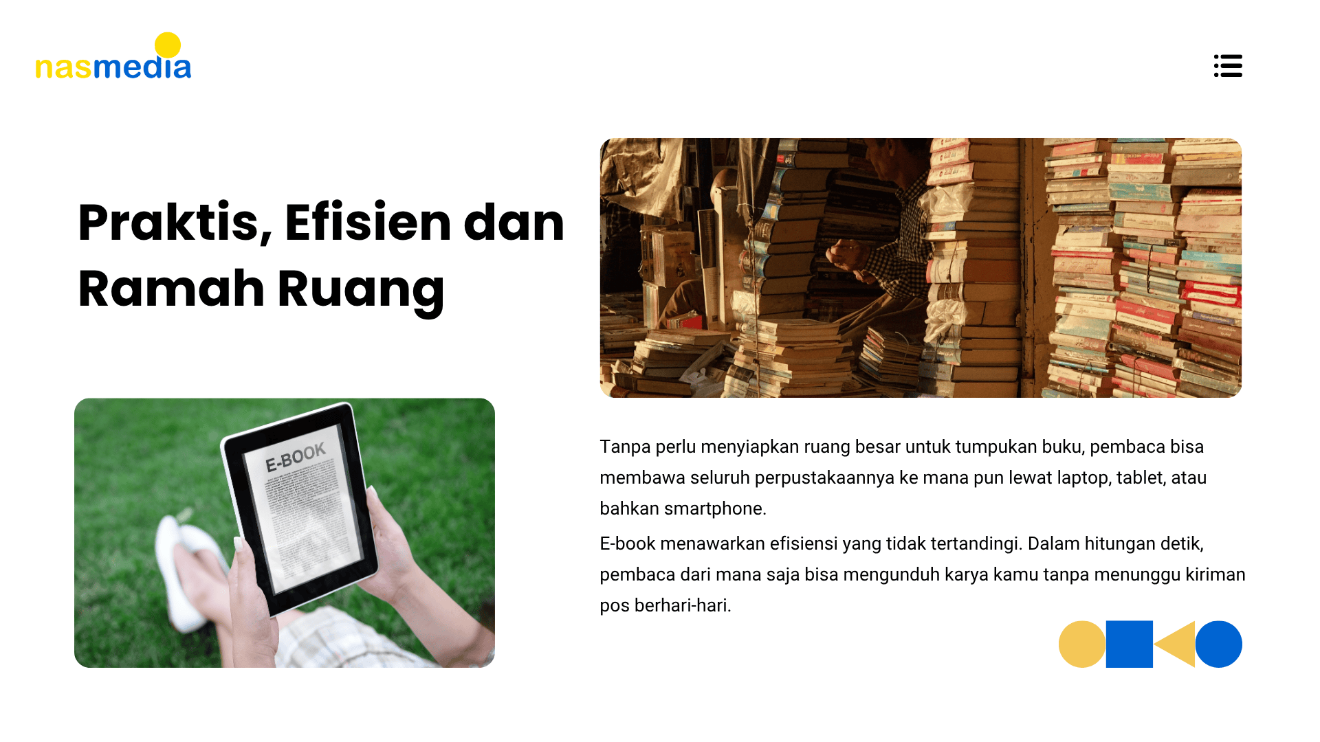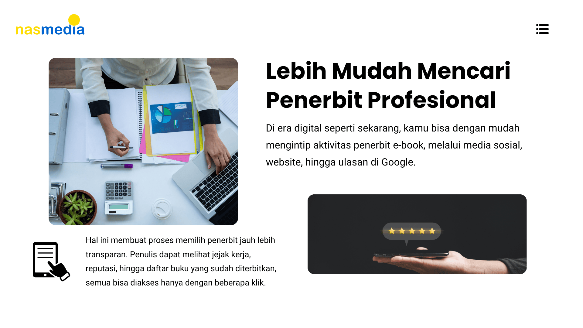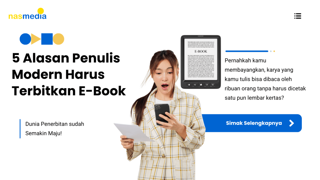 Penerbit e-book seperti Nasmedia hadir untuk menjembatani kebutuhan itu, memberi kemudahan bagi penulis yang ingin fokus pada isi, bukan di proses teknis.