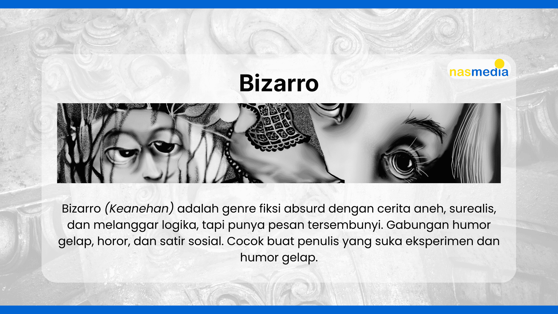 Bizarro merupakan genre fiksi yang mengusung keanehan sebagai daya tarik utama. Ceritanya sering absurd, surealis, dan melanggar logika umum, namun tetap memiliki pola dan pesan tertentu.