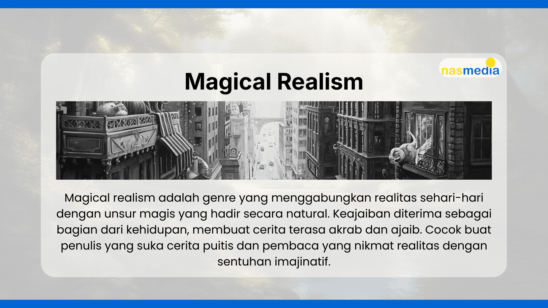 Genre ini banyak pembaca temukan dalam sastra dunia dan sering penulis gunakan untuk menggambarkan budaya, tradisi, serta pengalaman kolektif masyarakat. Unsur magis dalam magical realism biasanya bersifat simbolis dan memperkaya makna cerita.