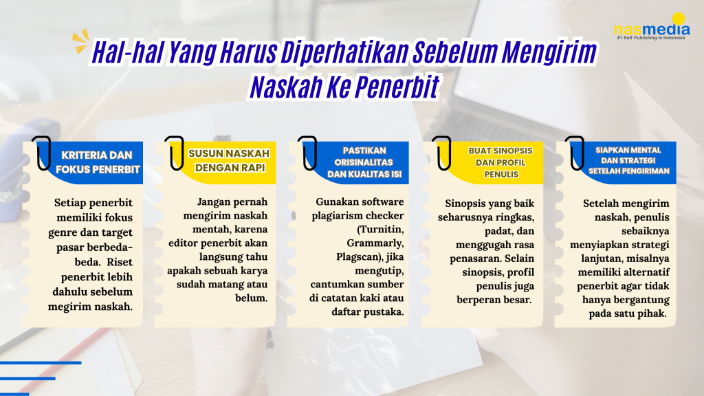 Mengirim naskah ke penerbit bukan hanya tentang keberanian menekan tombol send, melainkan tentang kesiapan dari berbagai aspek. Mulai dari memahami kriteria penerbit, menyusun naskah dengan rapi, menjaga orisinalitas, membuat sinopsis menarik, hingga menyiapkan mental setelah pengiriman.