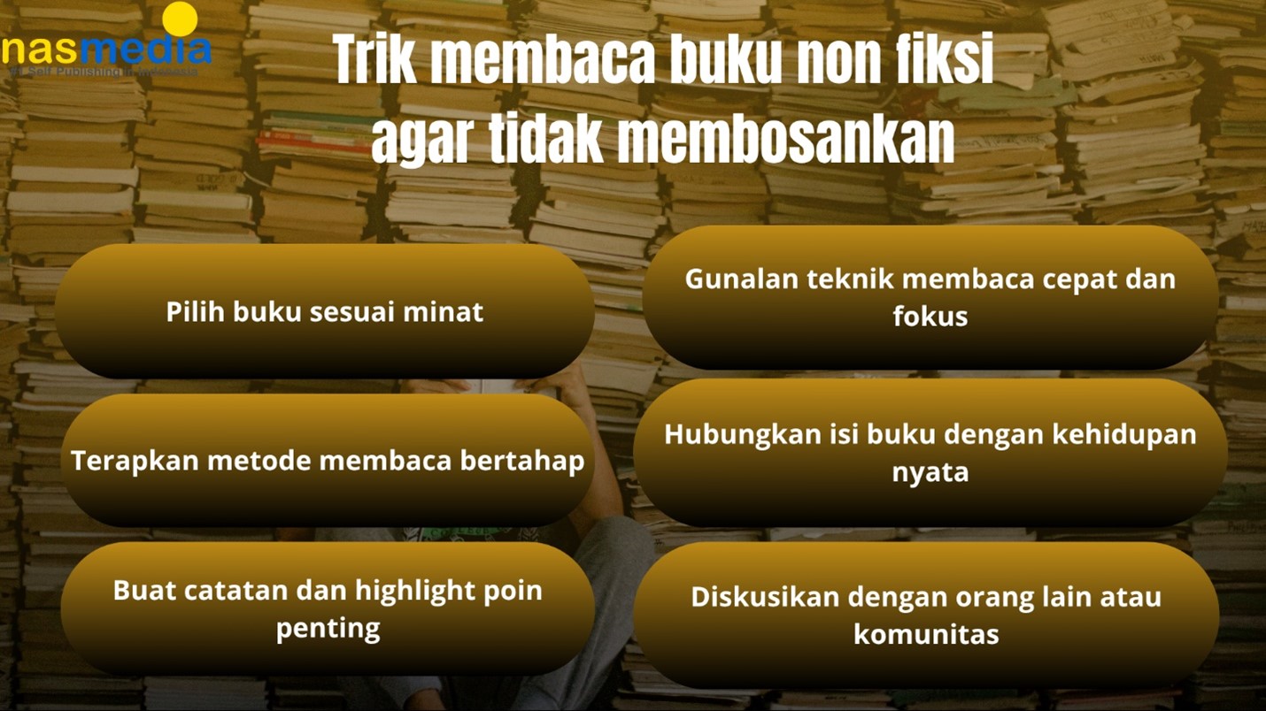 6 trik membaca buku non fiksi agar tidak membosankan dapat membantu pembaca menikmati proses membaca sekaligus memahami isi buku dengan lebih baik. Mulai dari memilih buku sesuai minat, menggunakan teknik membaca cepat, membuat catatan, membaca bertahap, menghubungkan isi dengan kehidupan, hingga berdiskusi dengan orang lain.