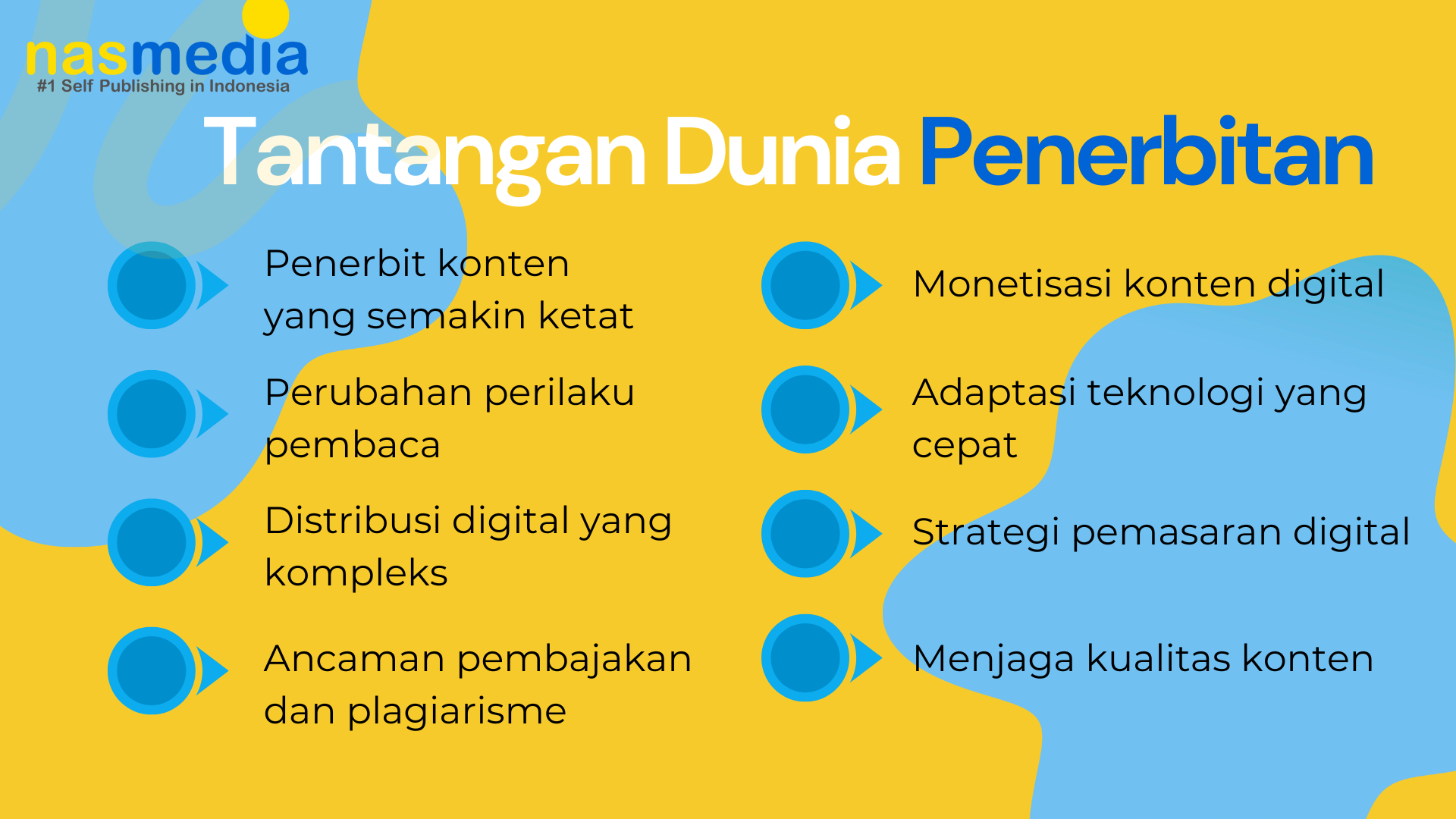 8 tantangan dunia penerbitan di era digital mencakup persaingan konten, perubahan perilaku pembaca, distribusi digital, ancaman pembajakan, monetisasi, adaptasi teknologi, strategi pemasaran, dan menjaga kualitas konten. Dengan memahami tantang ini, penerbit bisa menyiapkan strategi inovatif agar relevan dan kompetitif di era digital.
