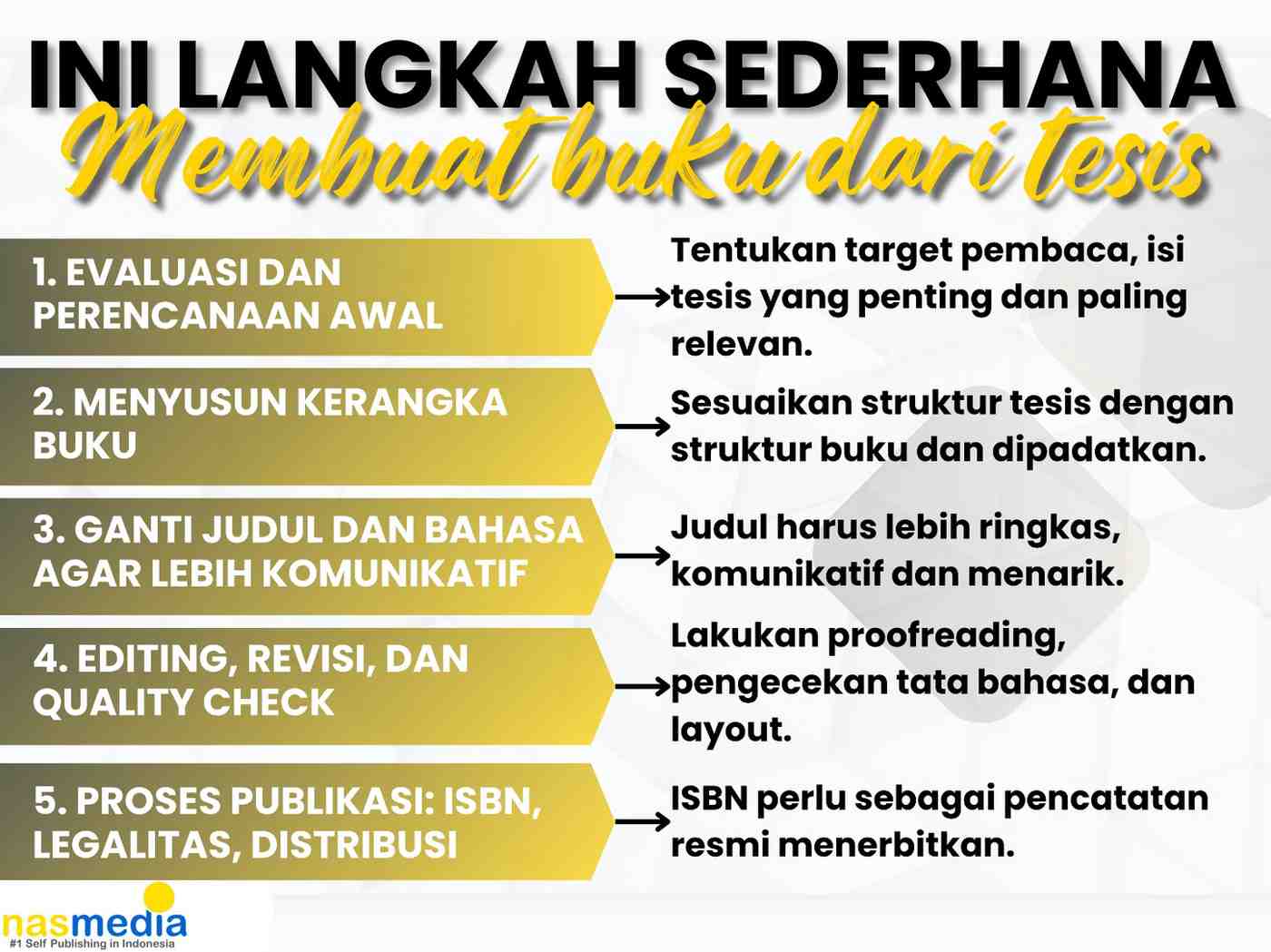Kalau kamu ingin lebih praktis, Nasmedia siap membantu mengubah tesis atau KTI kamu jadi buku resmi yang siap edar. Mulai dari penyuntingan, layout, ISBN, hingga promosi, semua bisa kamu dapatkan dalam satu paket layanan.
