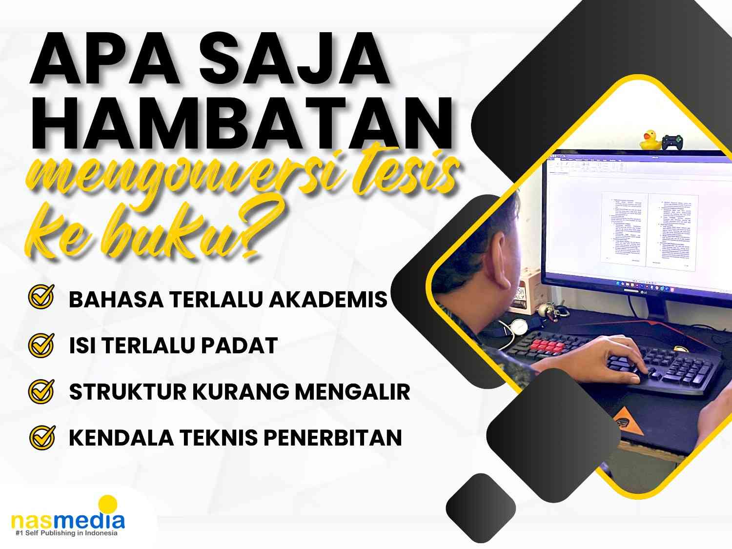 • Kendala teknis penerbitan: Penerbit profesional seperti Nasmedia siap membantu dari A sampai Z.