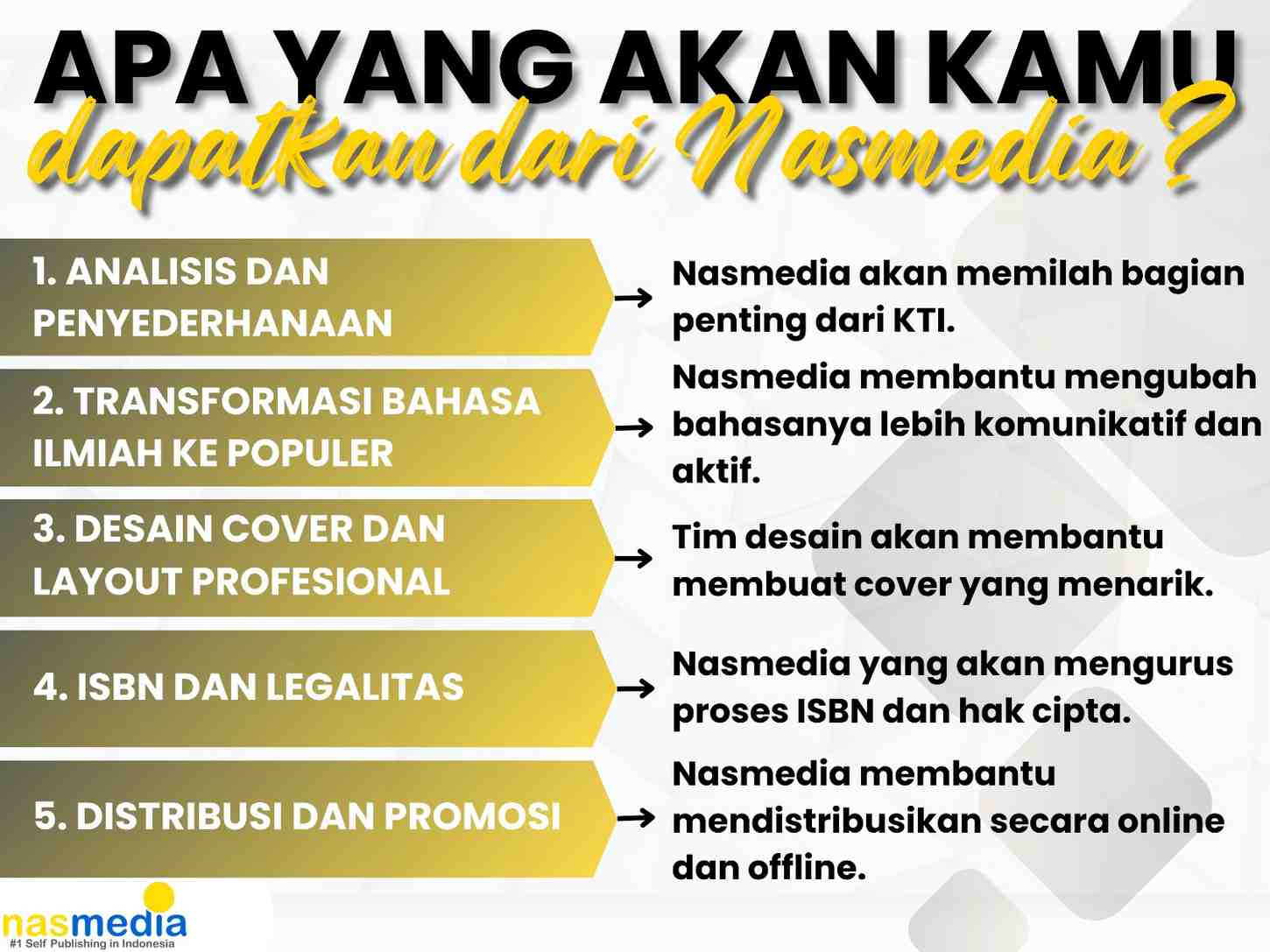 Kamu tak perlu repot mengurus ISBN atau hak cipta. Semua ini sudah menjadi bagian dari layanan Nasmedia.