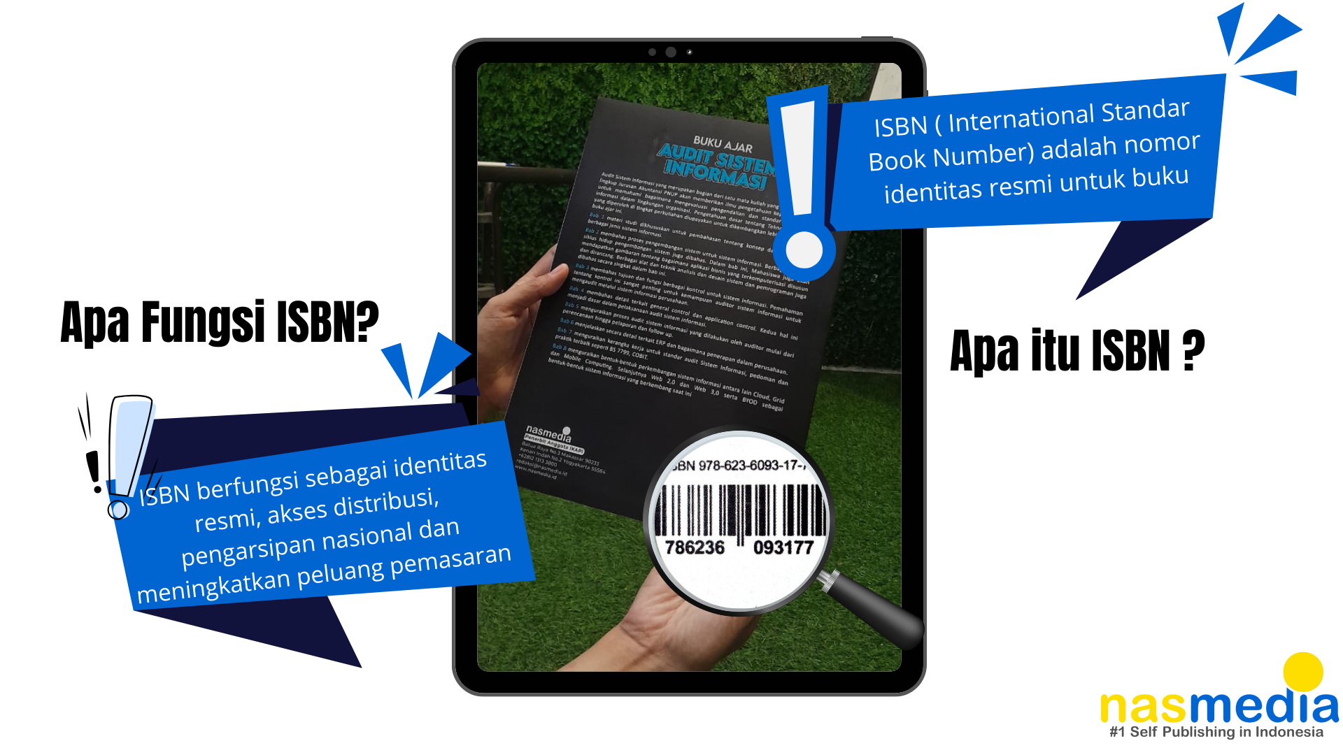 ISBN (International Standar Book Number) adalah nomor identitas resmi untuk buku. Setiap ISBN unik, sehingga satu buku tidak akan tertukar dengan yang lain meski judulnya sama. Dengan ISBN, karya penulis masuk dalam katalog Perpusnas dan terhubung ke database internasional