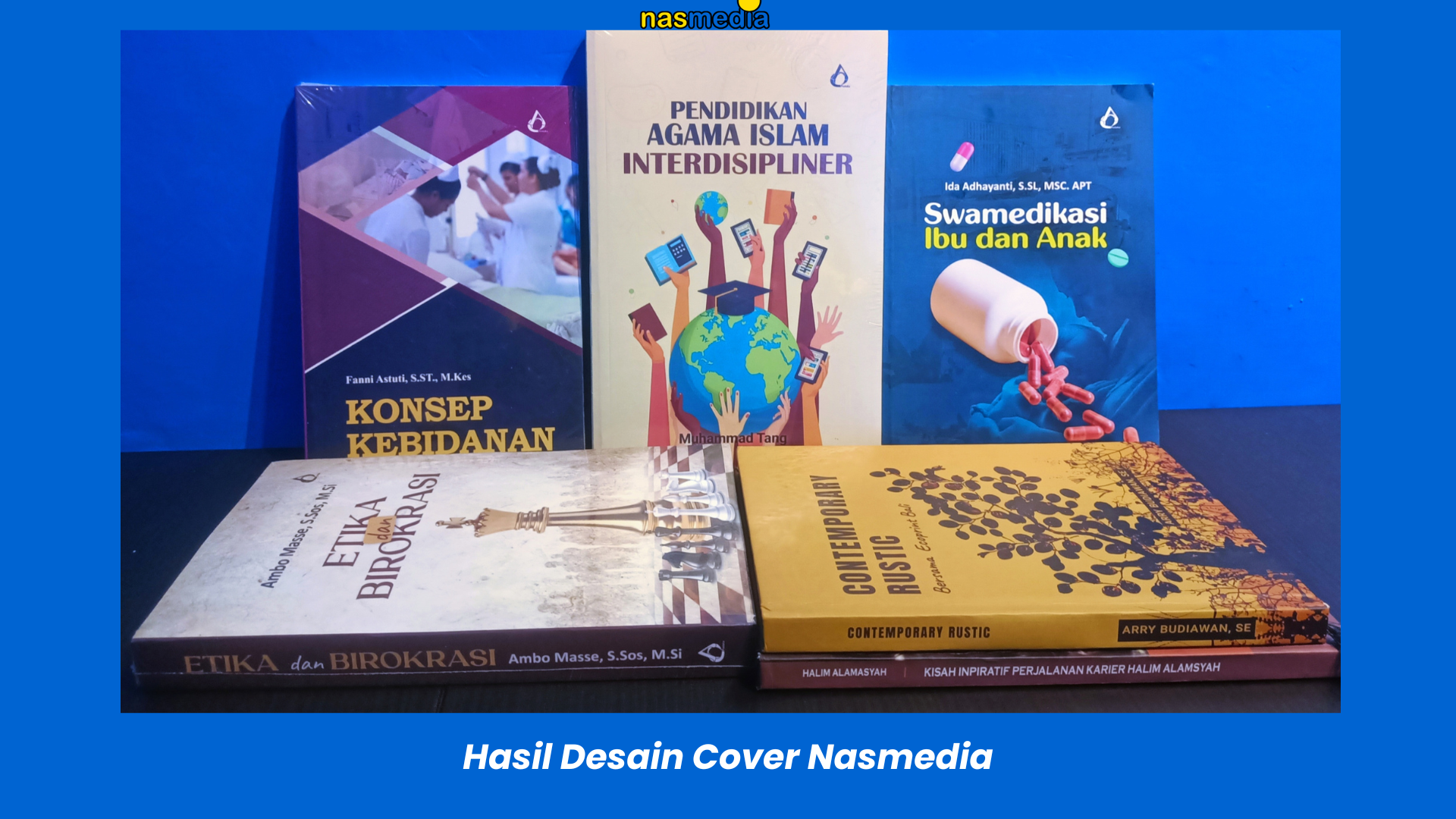 Tim desain Nasmedia tidak asal menempel gambar, tetapi memikirkan komposisi warna, tipografi, hingga detail kecil yang membangun identitas buku.