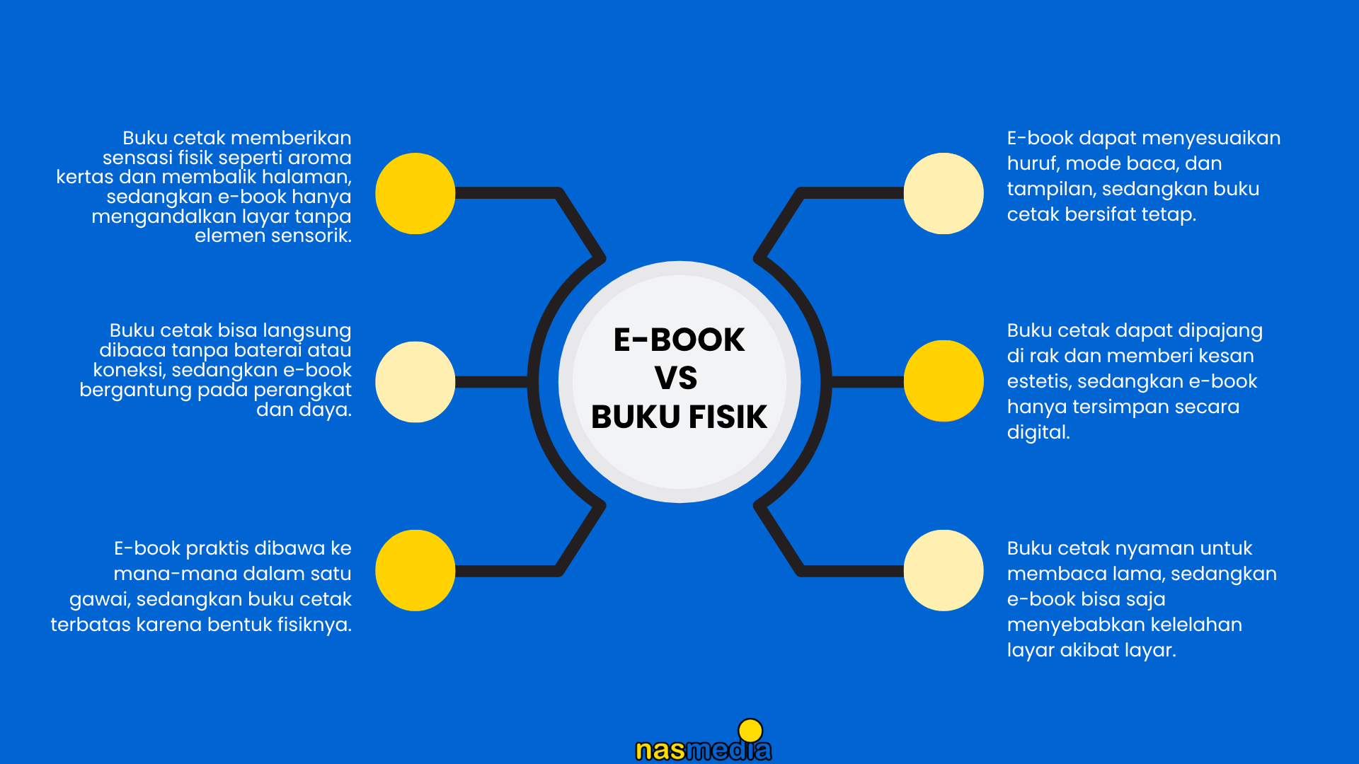 Keduanya memiliki kelebihan masing-masing. Buku cetak menawarkan pengalaman sensorik dan daya koleksi, sedangkan e-book memberikan kecepatan dan efisiensi.