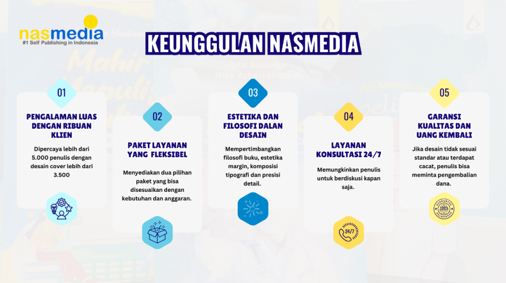 Sebagai salah satu penerbit sekaligus penyedia layanan desain cover, Nasmedia memiliki beberapa keunggulan: