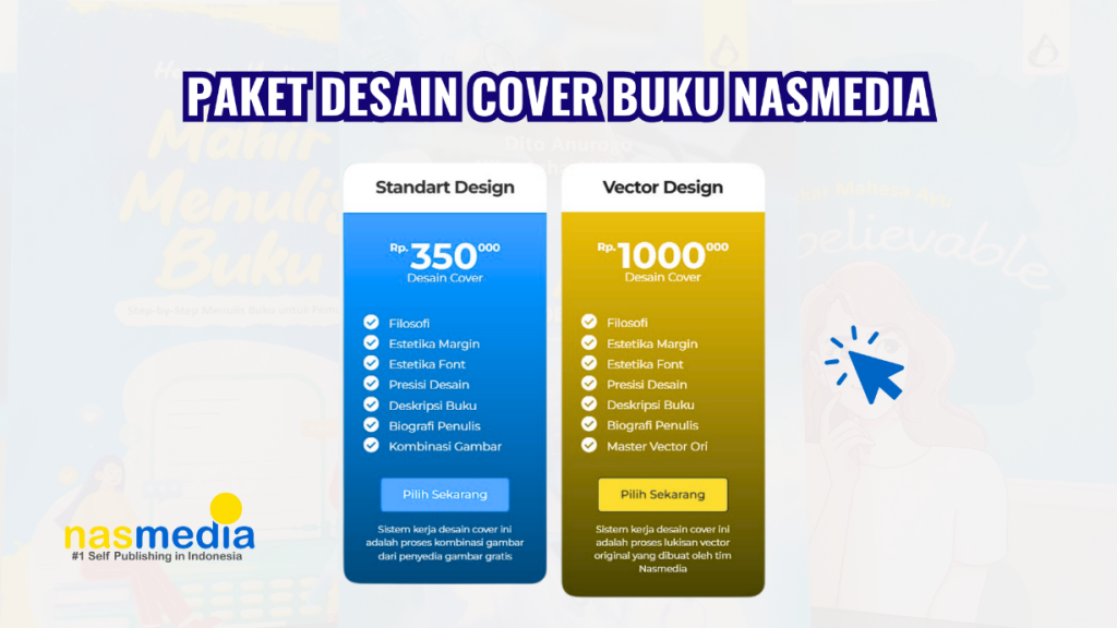 Tidak semua penulis memiliki anggaran besar. Karena itulah, Nasmedia menawarkan dua pilihan paket desain yang bisa kamu sesuaikan dengan kebutuhan: Standart Design dan Vector Design. Kamu bisa memilih paket yang paling sesuai dengan gaya dan tujuan bukumu tanpa mengorbankan kualitas.