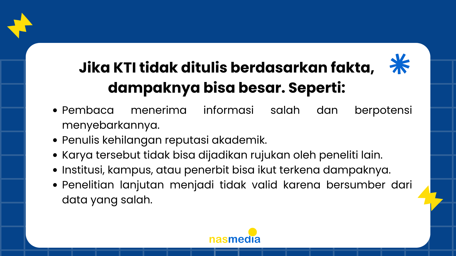Karya ilmiah harus disusun berdasarkan fakta dan data yang dapat diverifikasi. Artinya, penulis tidak boleh mengubah, menambah, atau mengurangi data hanya demi mendukung pendapat pribadi.