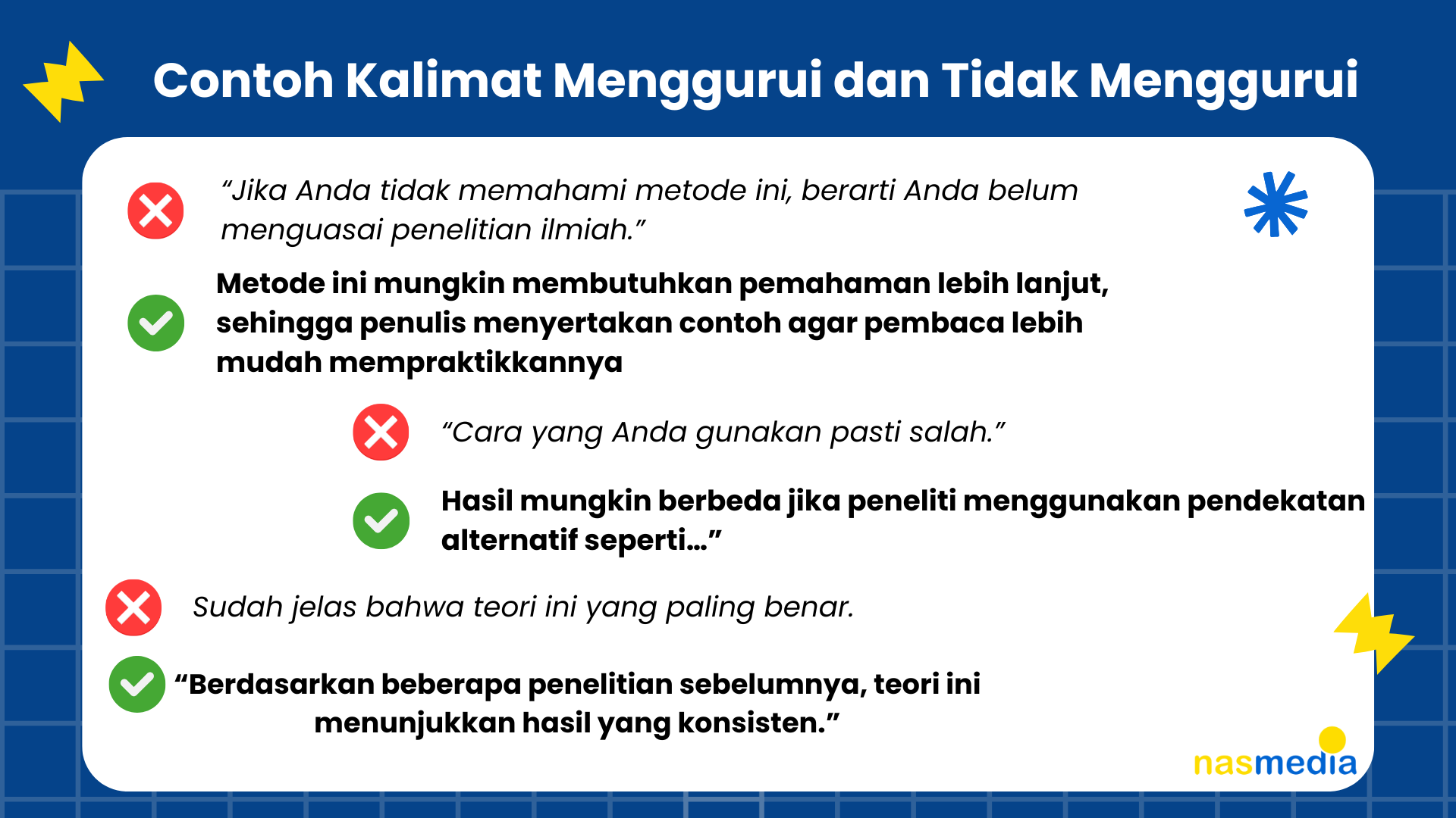 Bahasa yang sopan menunjukkan bahwa penulis menghargai pembaca dan menyadari bahwa penelitian ilmiah adalah ruang diskusi, bukan ruang untuk menyatakan diri paling benar.