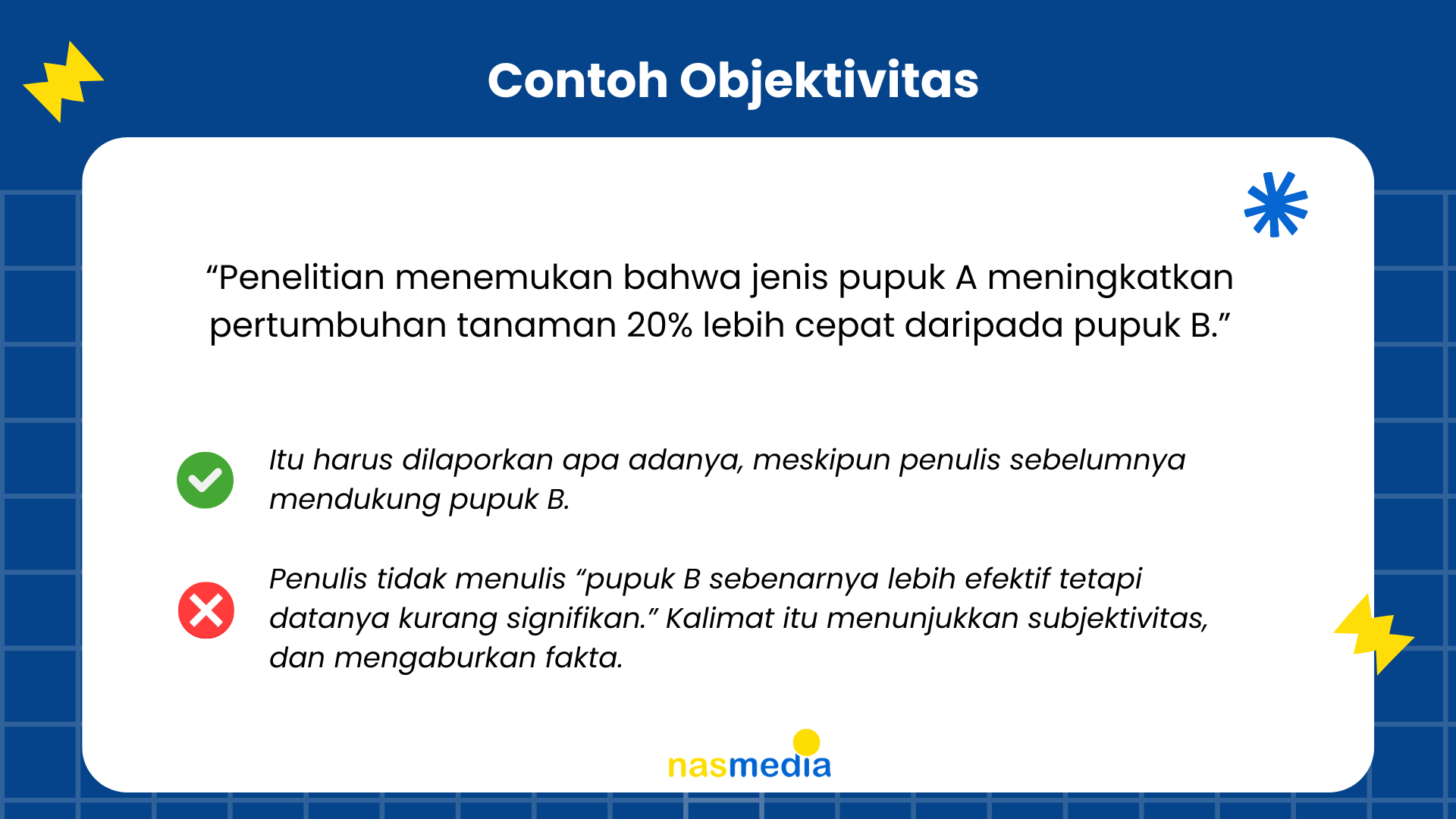Objektivitas menunjukkan profesionalitas. Tanpa objektivitas, KTI kehilangan kredibilitas dan fungsinya sebagai karya ilmiah.