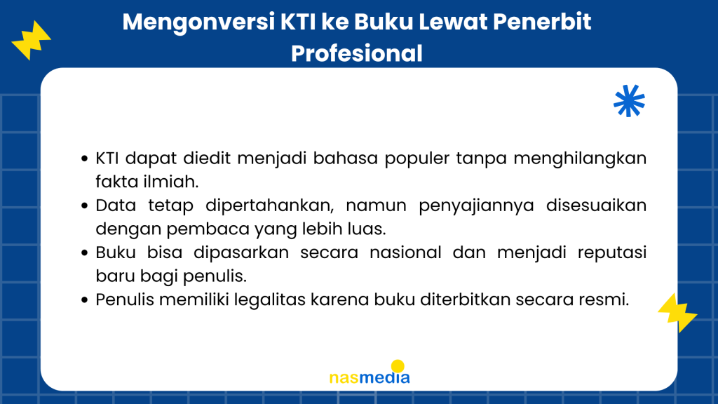 Konversi KTI menjadi buku bukan hanya menambah manfaat penelitian, tetapi membuka peluang baru bagi penulis untuk dikenal di lingkungan akademik maupun masyarakat umum.