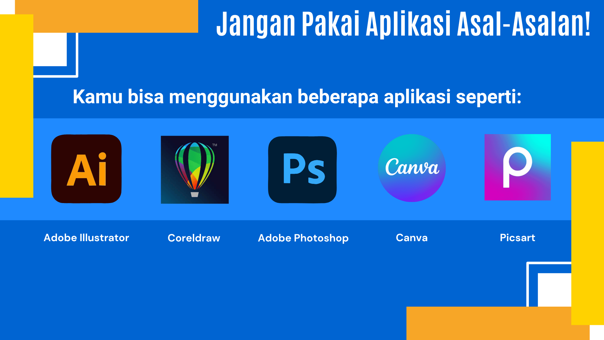 Coba pakai aplikasi desain yang memang mendukung hasil bagus, seperti Adobe Illustrator, Corel Draw, Adobe Photoshop, Canva, Picsart, dan lainnya.