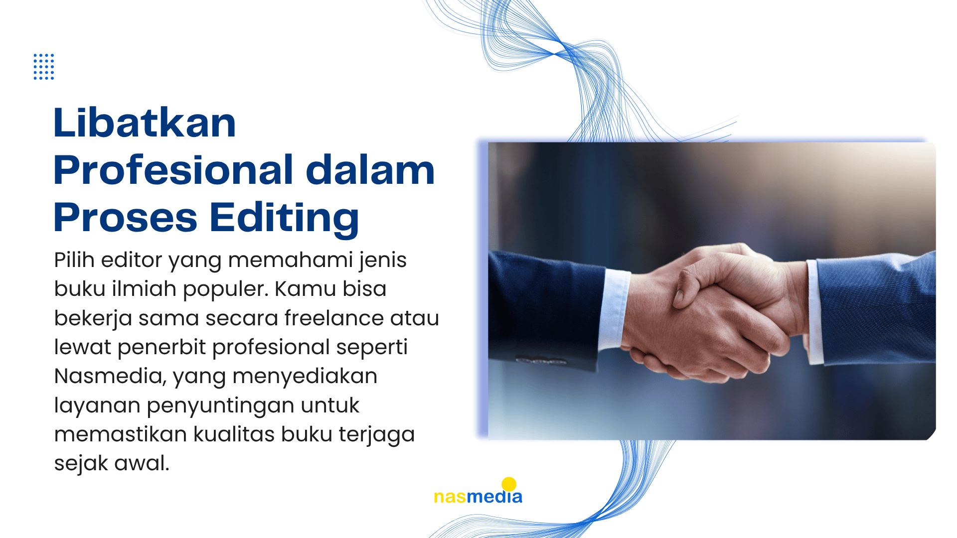 Langkahnya jelas, pilih editor yang memahami jenis buku ilmiah populer. Kamu bisa bekerja sama secara freelance atau lewat penerbit profesional seperti Nasmedia, yang menyediakan layanan penyuntingan untuk memastikan kualitas buku terjaga sejak awal.
