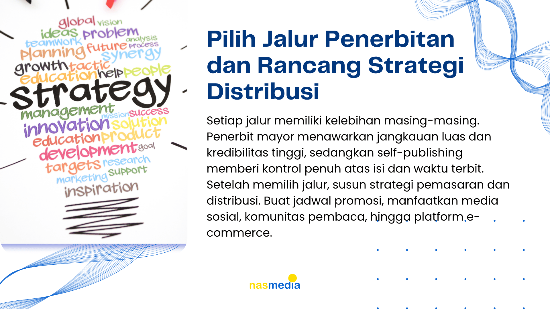 Setelah memilih jalur, susun strategi pemasaran dan distribusi. Buat jadwal promosi, manfaatkan media sosial, komunitas pembaca, hingga platform e-commerce.