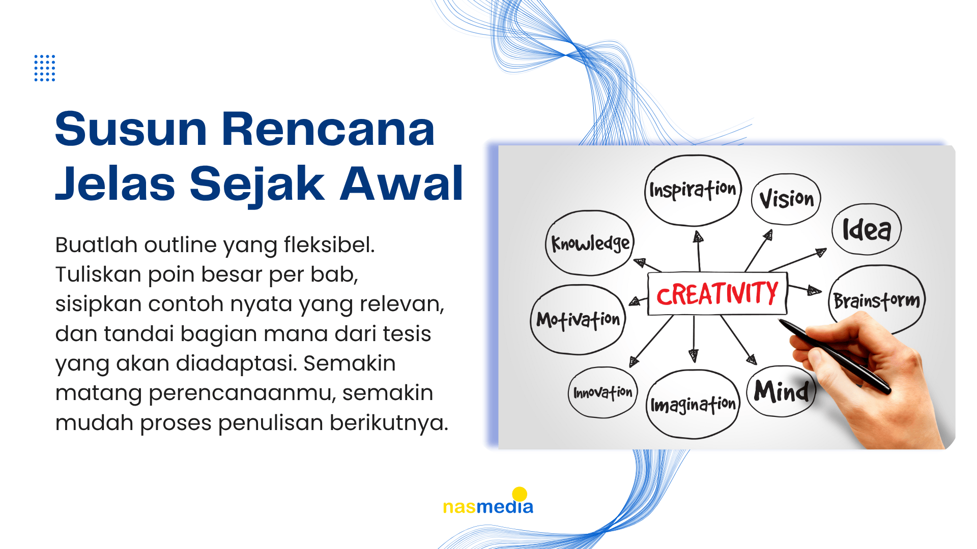 Solusinya, buatlah outline yang fleksibel. Tuliskan poin besar per bab, sisipkan contoh nyata yang relevan, dan tandai bagian mana dari tesis yang akan diadaptasi.