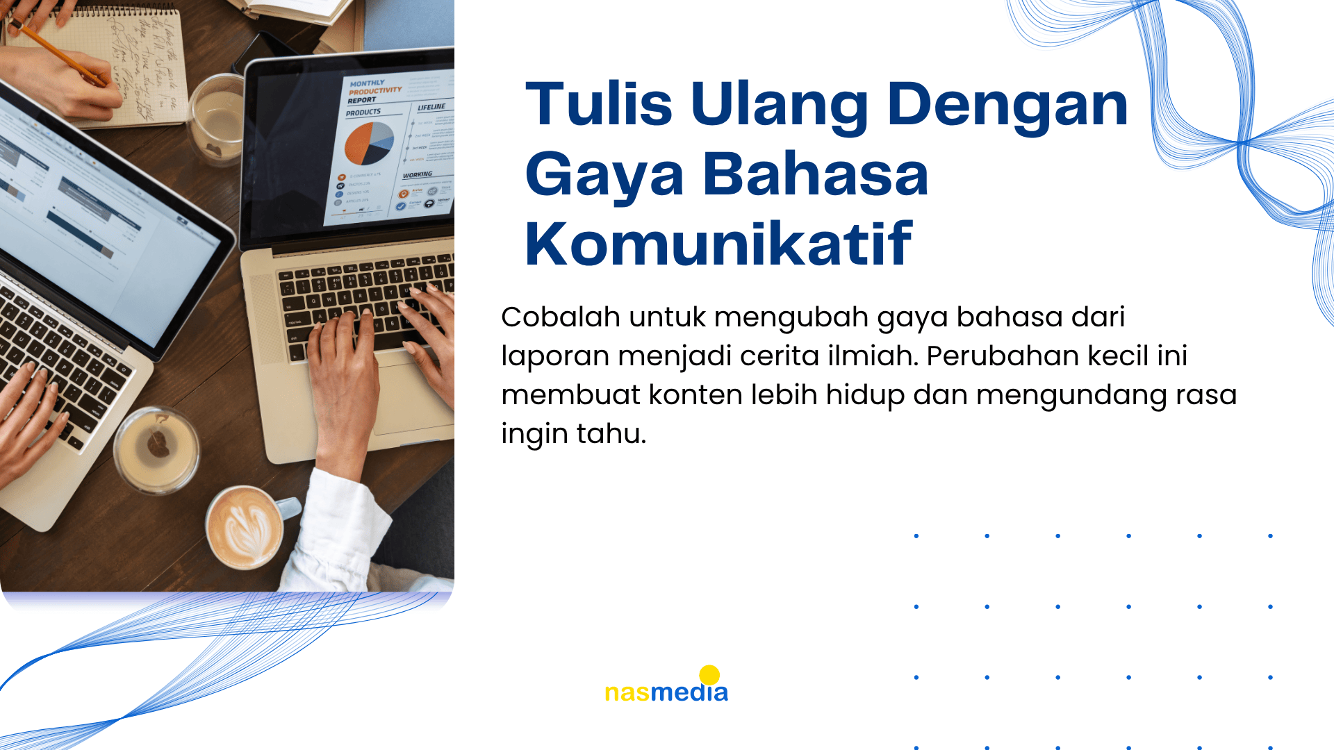 Cobalah untuk mengubah gaya bahasa dari laporan menjadi cerita ilmiah. Perubahan kecil ini membuat konten lebih hidup dan mengundang rasa ingin tahu.
