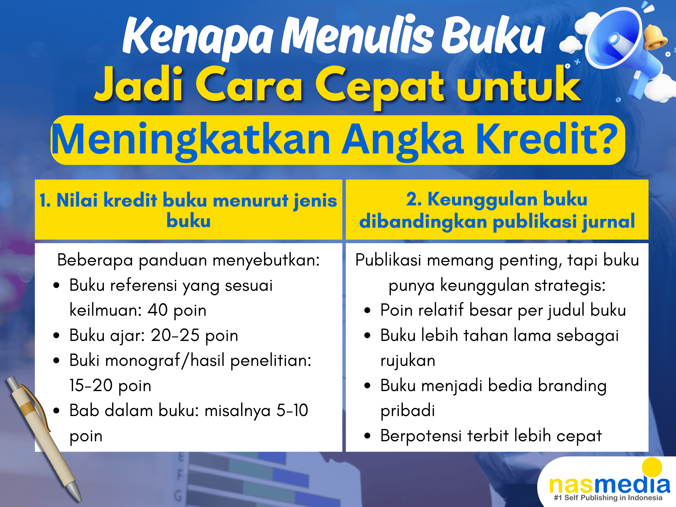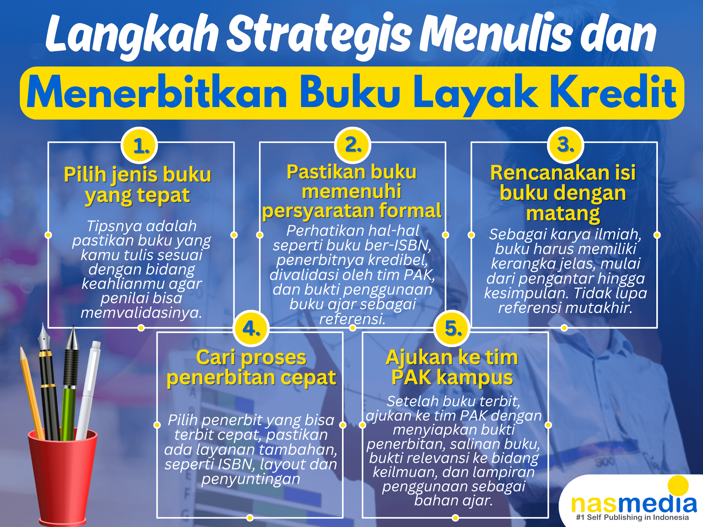 Jangan tunggu lama untuk memanfaatkan menulis buku sebagai strategi cepat meningkatkan angka kredit dosen. Bila kamu mulai sekarang merencanakan satu buku berkualitas dan memilih penerbit terpercaya seperti Nasmedia, peluang naik jabatan akademik semakin besar.