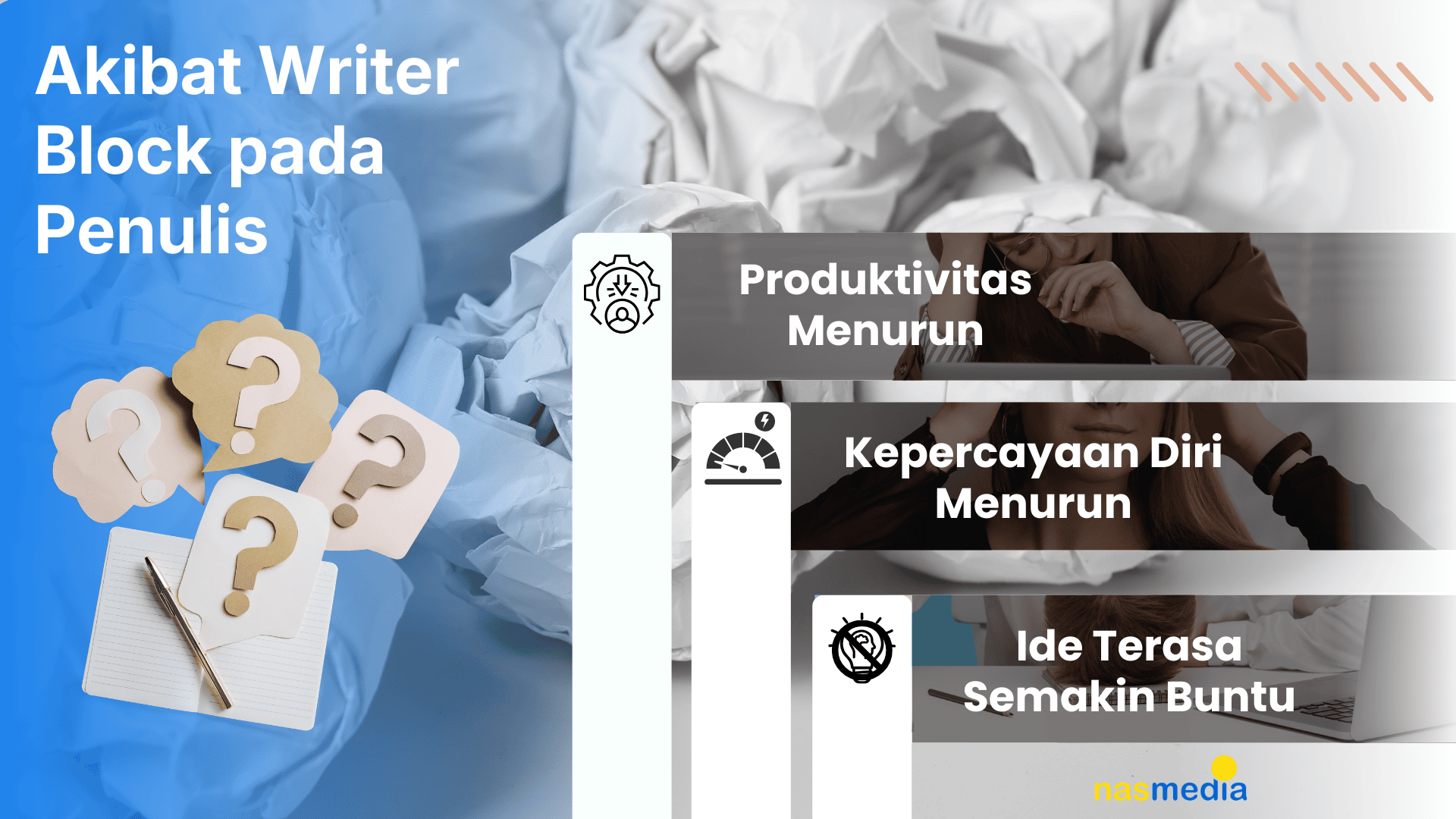 Jika seperti itu terlalu lama, writer block bisa berdampak pada produktivitas, kualitas tulisan, bahkan kepercayaan diri penulis itu sendiri.
