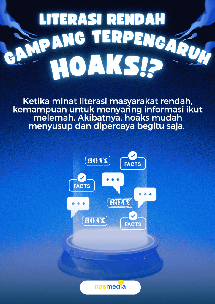 Persoalan literasi mulai terlihat nyata, kemudian, saat minat literasi masyarakat rendah, kemampuan untuk menyaring informasi ikut melemah. Akibatnya, hoaks mudah menyusup dan dipercaya begitu saja.