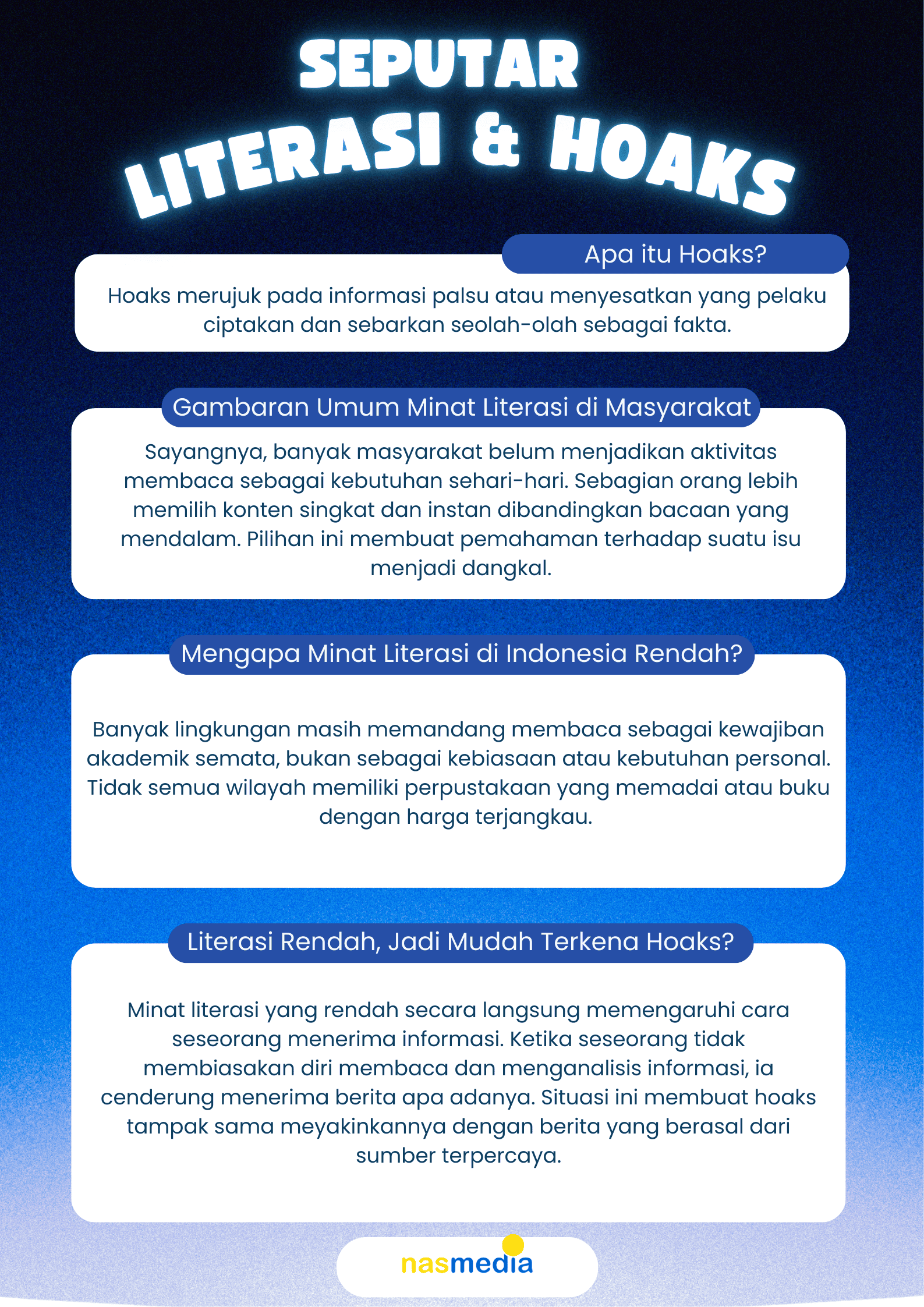 Jadi, tahukah kamu bahwa minat literasi rendah menyebabkan gampang terpengaruh hoaks? Kita akan membahas hubungan antara literasi dan hoaks, sekaligus mengajak kamu melihat pentingnya membangun budaya membaca di tengah masyarakat.