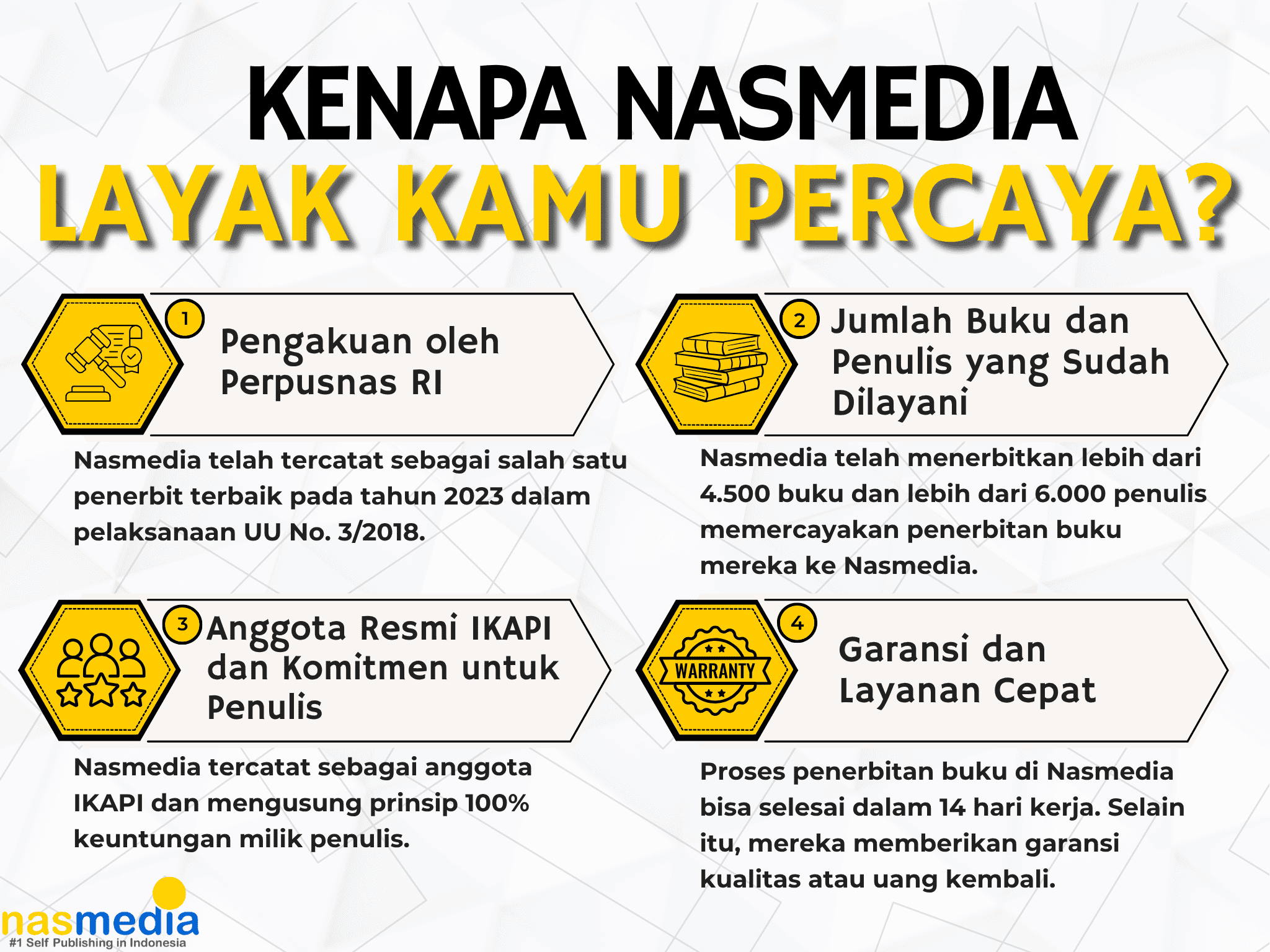 Beneran bisa? Ya, dan bukan sekadar janji kosong. Sebab, Nasmedia adalah penerbit self-publishing yang semakin terkenal di Indonesia, memiliki rekam jejak dan layanan yang mendukung misi kamu.