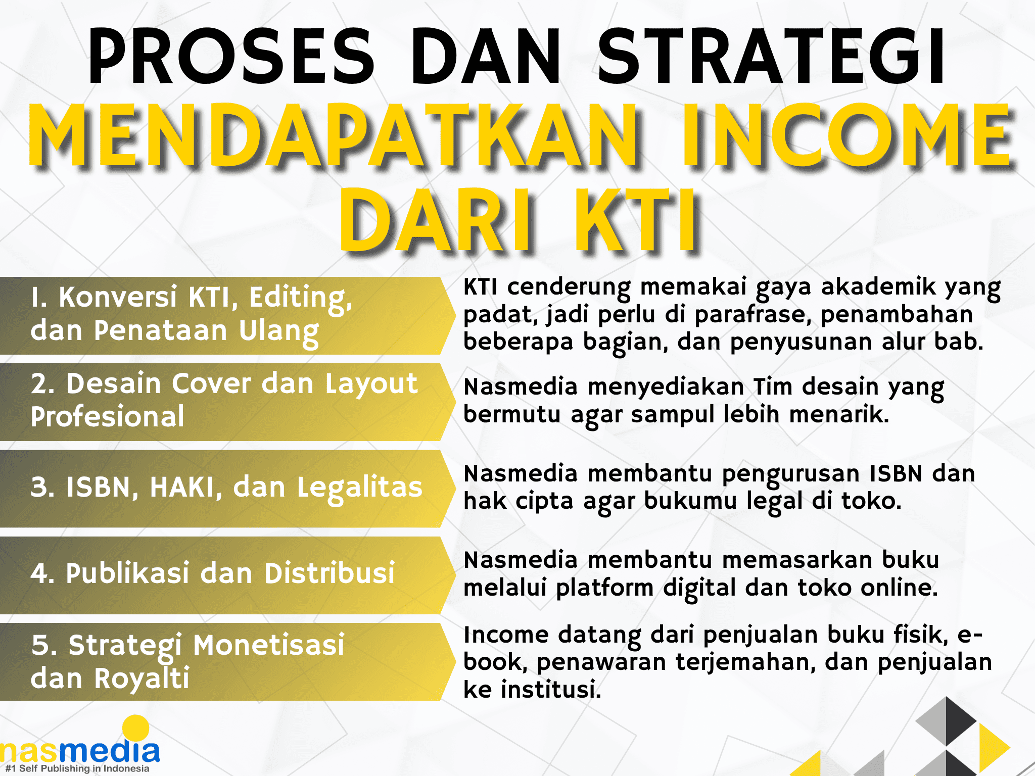 Jadi, jangan bingung mulai darimana buat jadiin KTI kamu sebagai income. Nasmedia siap membantu dan mendampingi dari naskah awal hingga bukumu berada di tangan pembaca dan menghasilkan.