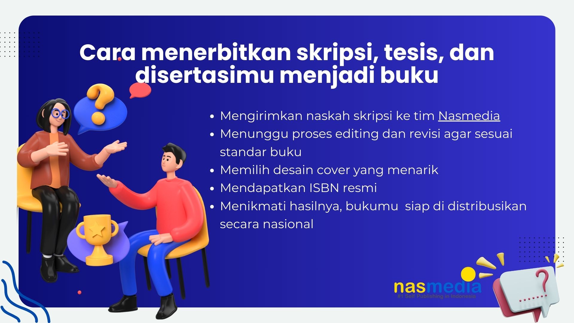 Jika kamu serius ingin menerbitkan skripsi, tesis, dan disertasi menjadi buku, Nasmedia adalah partner yang tepat. Sebagai salah satu penerbit buku di Indonesia, Nasmedia berpengalaman membantu mahasiswa dan akademisi mengubah skripsi, tesis dan disertasi menjadi buku berkualitas.