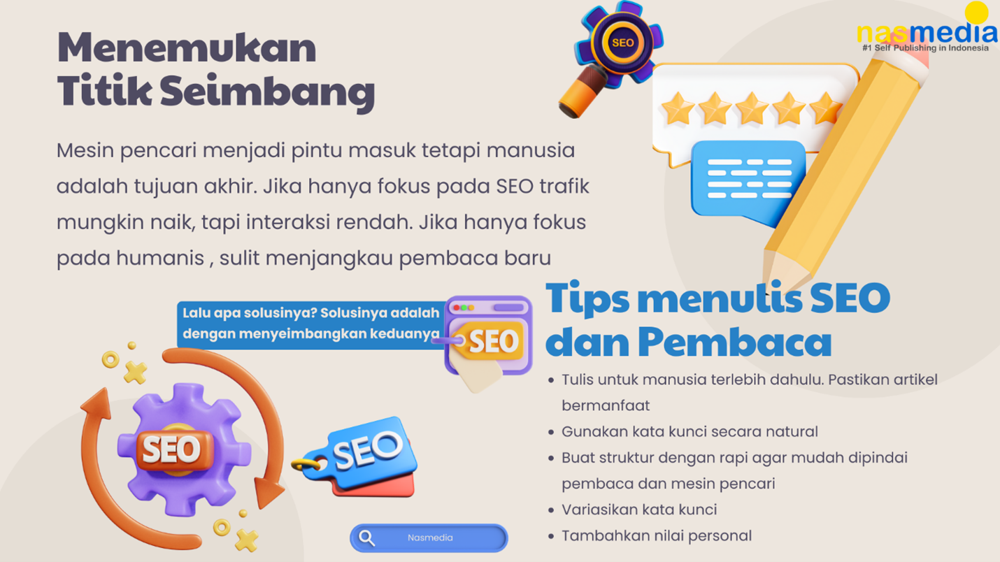 Artikel yang SEO-friendly memang mudah masuk halaman pertama Google, tetapi jika bahasanya kaku, pembaca cepat pergi. Sebaliknya, tulisan yang humanis, enak dibaca, membuat pembaca betah, namun sering tenggelam karena kurang optimasi.