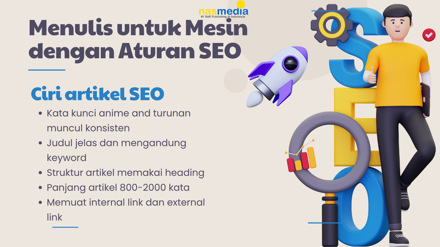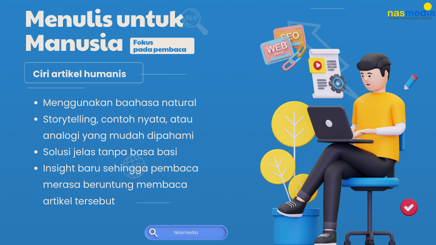Artikel SEO meningkatkan peluang tampil di halaman pertama Google. Trafik website naik, konversi pun lebih besar. Namun, artikel yang terlalu padat kata kunci terasa kaku dan repetitif membuat pembaca cepat bosan dan menutup halaman. Karena itu, penulis juga perlu menulis untuk manusia.