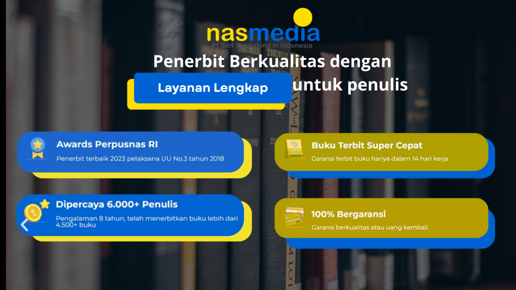 Nasmedia penerbit berkualitas dengan layanan lengkap untuk semua penulis menjadi mitra terpercaya bagi siapa pun yang ingin menerbitkan karya dengan kualitas tinggi. Berbekal reputasi yang solid, Nasmedia menghadirkan layanan editing profesional, desain ekslusif, kualitas cetak premium, distribusi luas, perlindungan hak cipta, serta biaya transparan. Semua itu untuk memastikan setiap penulis memperoleh pengalaman penerbitan yang memuaskan.