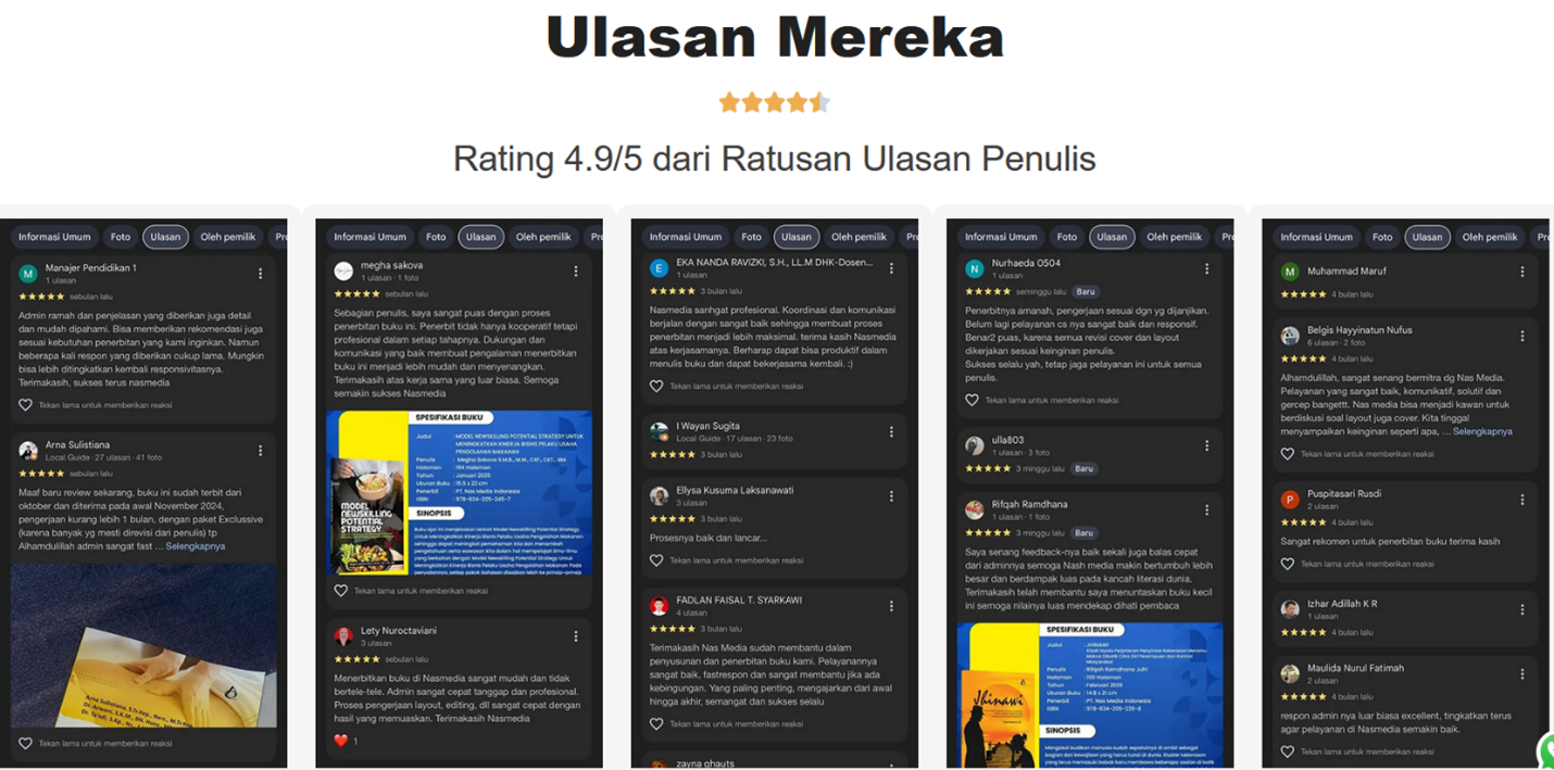 Banyak penulis yang telah bekerja sama dengan Nasmedia merasakan manfaat nyata. Buku mereka tidak hanya terbit, tetapi juga dipasarkan secara luas dan meningkatkan kredibilitas pribadi maupun profesional.