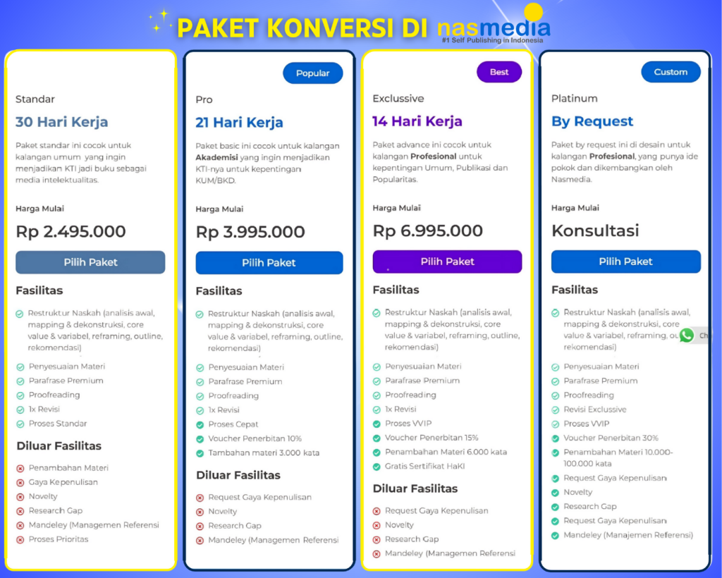 Nasmedia menawarkan beberapa pilihan paket konversi karya ilmiah menjadi buku yang bisa dosen sesuaikan dengan kebutuhan dan anggarannya.