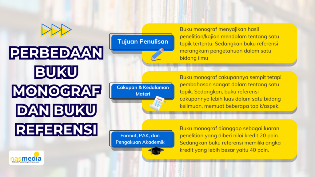 Buku monograf dan buku referensi memiliki perbedaan dari tujuan penulisan, cakupan dan kedalaman materi, hingga format/pengakuan akademik.