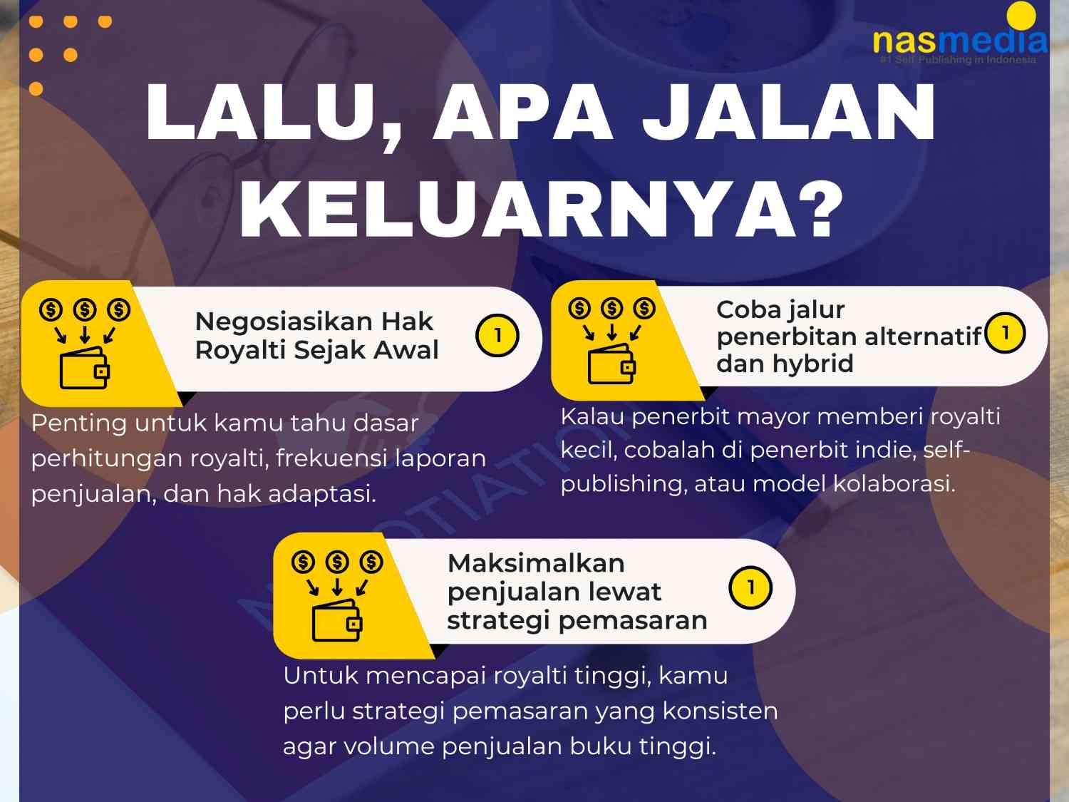 Terakhir, usulkan adanya batas minimum royalti, sehingga meskipun penjualan buku kurang laku, jerih payahmu tetap dihargai dengan jumlah tertentu.