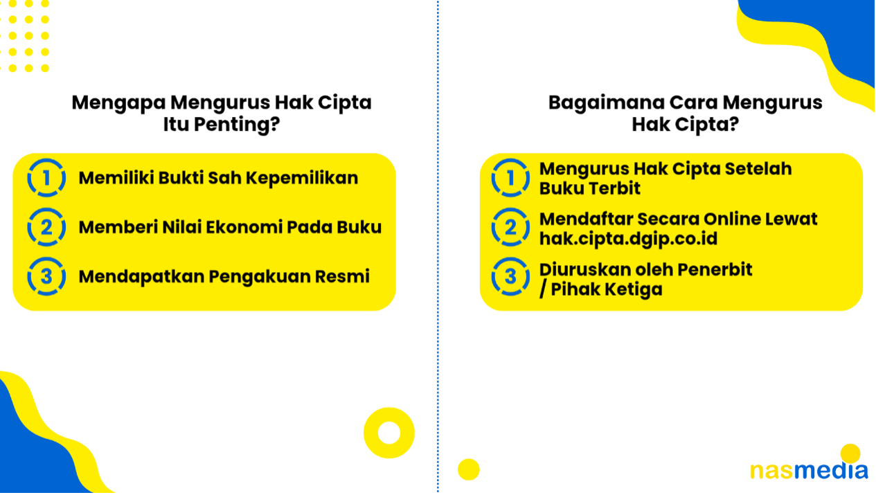 Kamu juga bisa melakukan prosesnya melalui pihak ketiga yang terdaftar secara resmi, misalnya lewat situs hakcipta.dgip.go.id. Atau penerbit bukumu lah yang membantu pengurusan hak cipta itu.