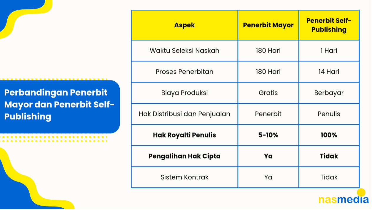 Namun untuk penerbitan self-publishing, jumlahnya masih sangat terbatas. Pelopor self-publishing pertama di Indonesia adalah Nasmedia.