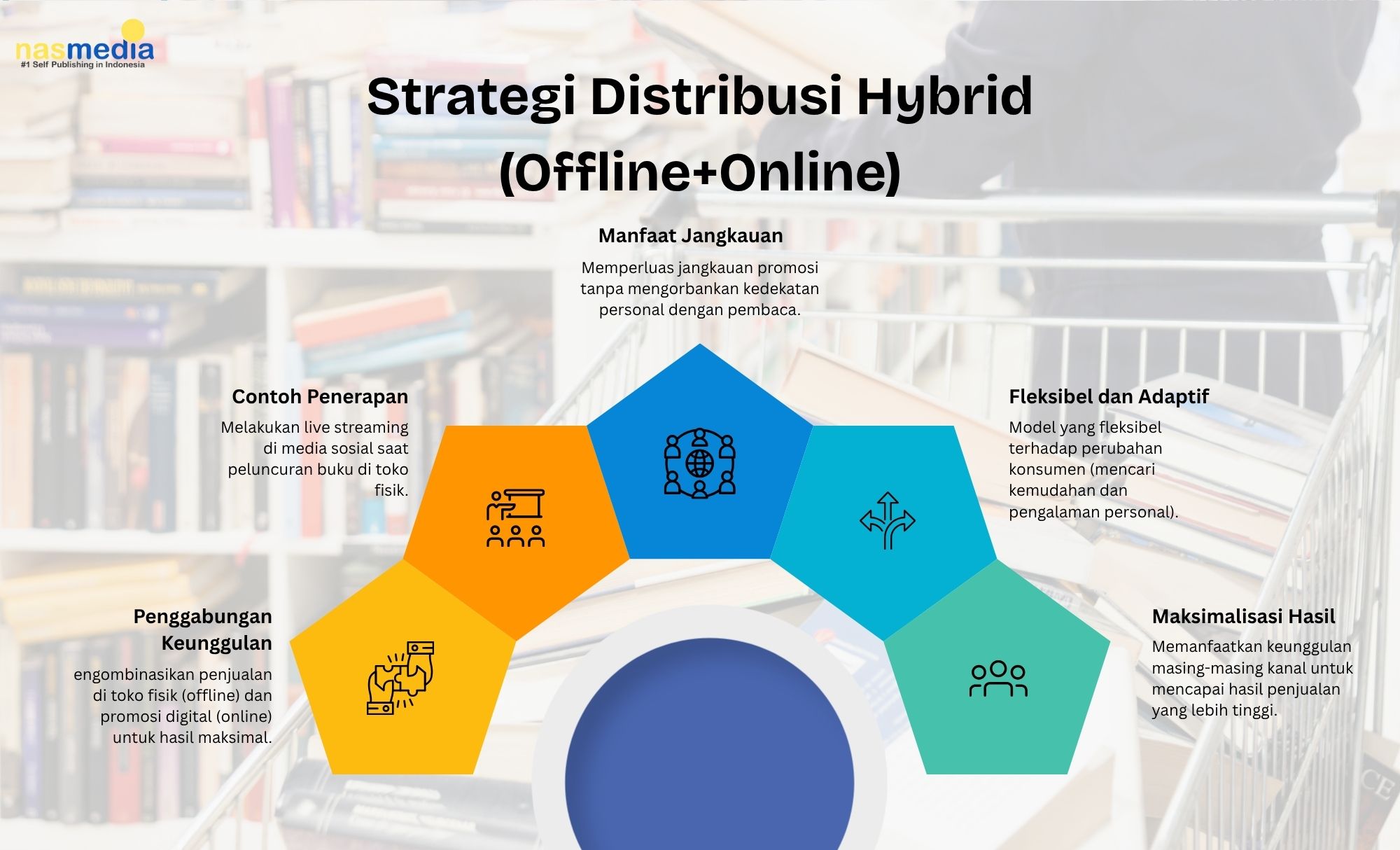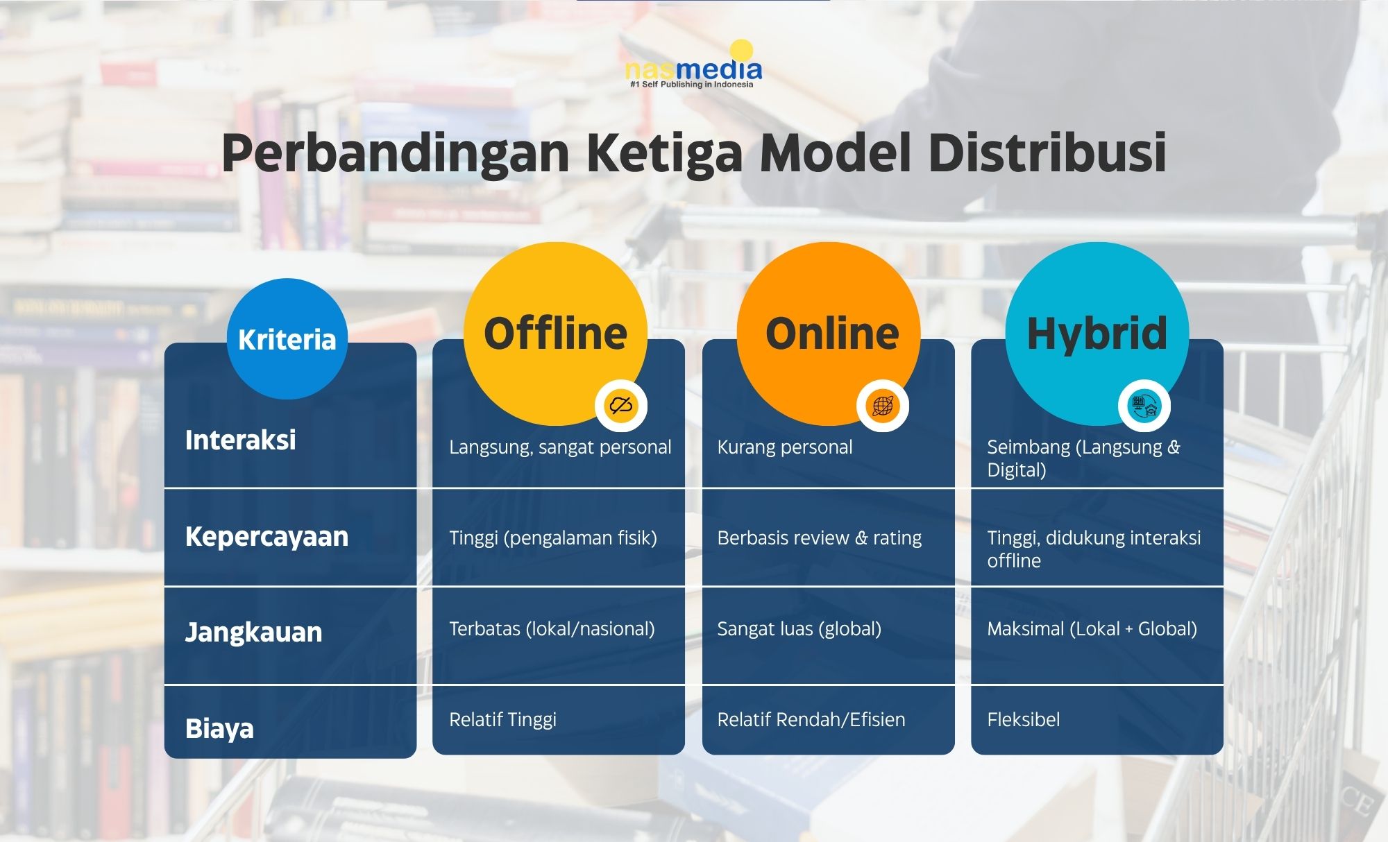 - Hybrid: Menggabungkan keunggulan offline dan online, membuat distribusi jadi lebih fleksibel, serta mampu menjangkau lebih banyak pembaca secara seimbang.