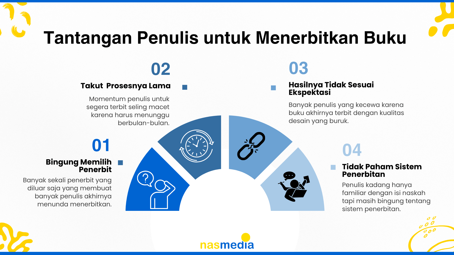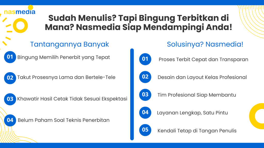 Kabar baiknya, Anda tidak sendirian. Nasmedia hadir untuk mendampingi Anda dari awal hingga buku benar-benar sampai ke tangan pembaca.