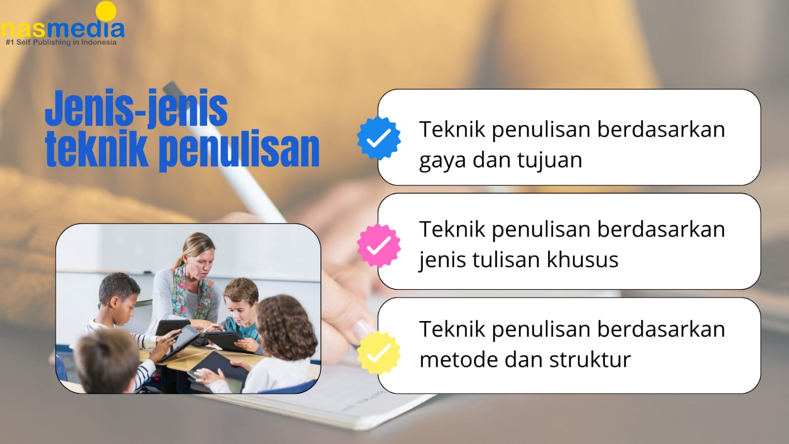 Dalam dunia kepenulisan kita dapat mengelompokkan teknik menulis ke dalam empat kategori utama: gaya dan tujuan utama, jenis tulisan khusus, metode dan struktur. Dengan memahami pengelompokan ini, penulis dapat menyesuaikan gaya tulisannya untuk kebutuhan akademik, pemasaran, maupun kreatif.