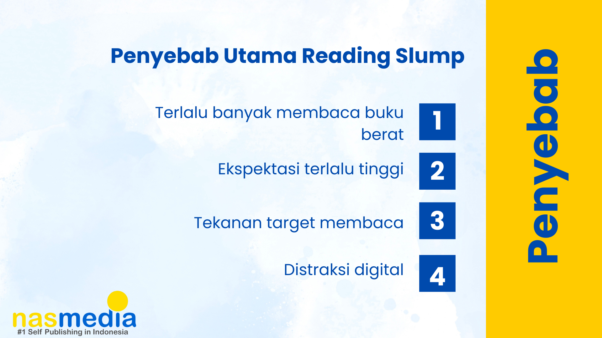 Reading slump tidak muncul tanpa alasan. Beberapa penyebab utama sering terjadi dalam kehidupan pembaca.