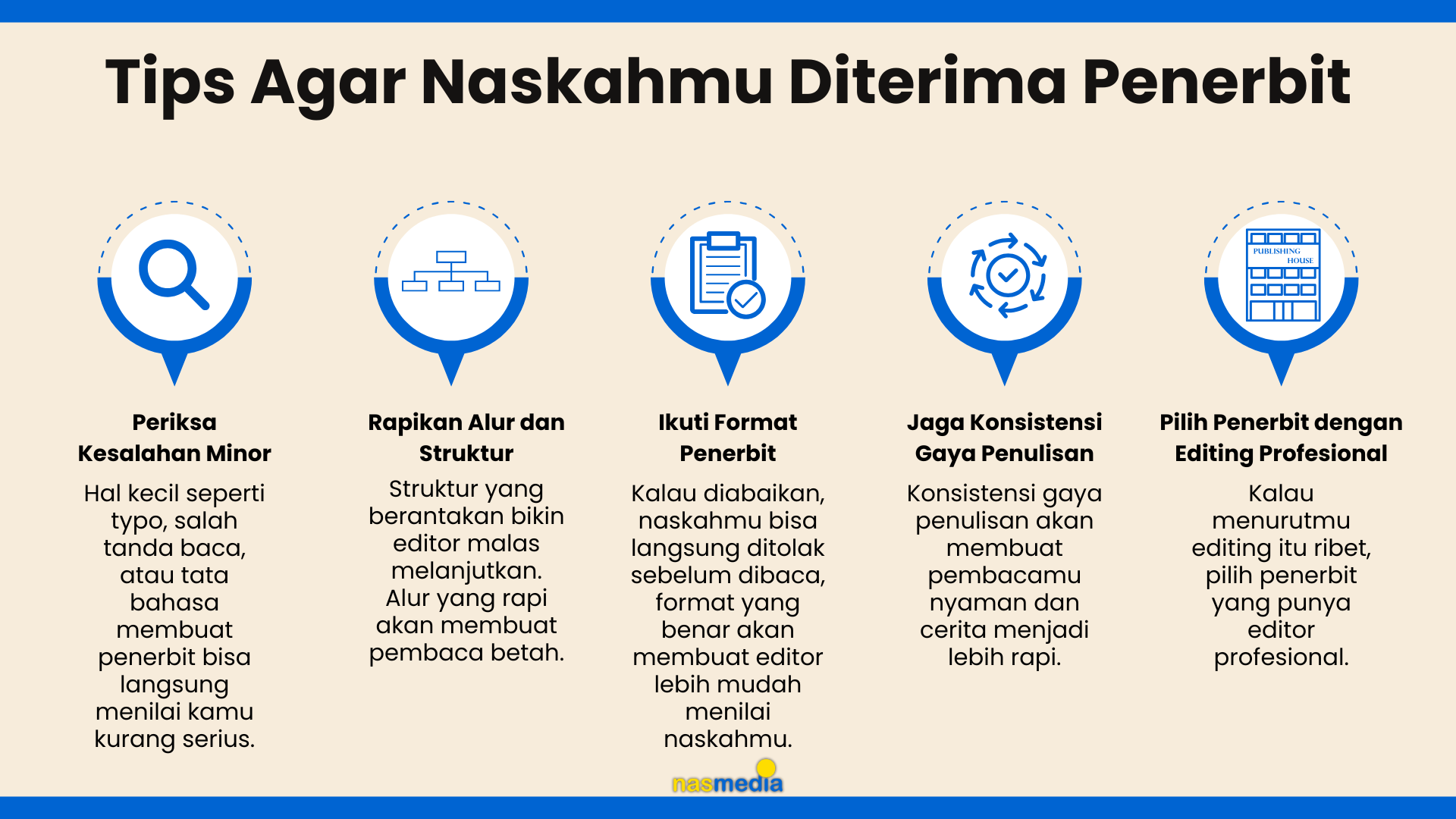 Salah satu penerbit yang punya layanan ini adalah Nasmedia. Di sini, editor profesional akan bantu kamu ngecek bahasa, alur, sampai format naskah biar sesuai standar.