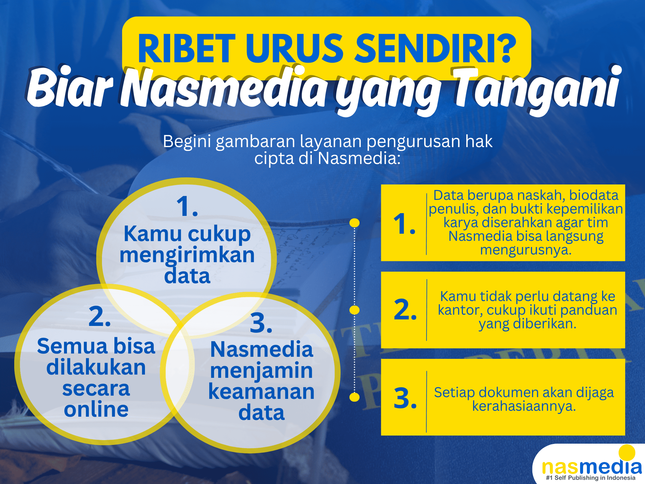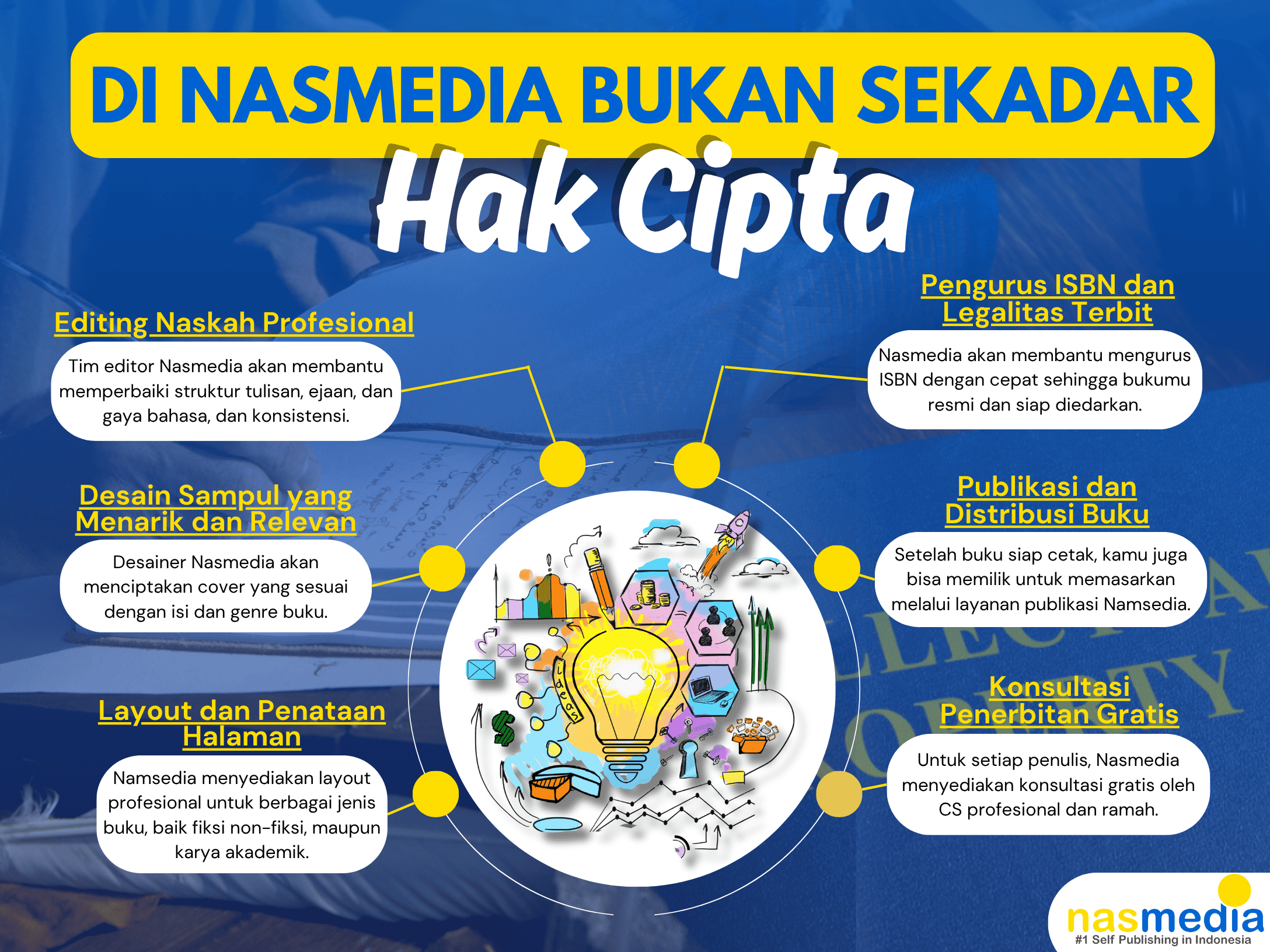 Dengan Nasmedia, semua urusan administratif seperti HAKI dan penerbitan bisa kamu lakukan dengan praktis, cepat, dan terpercaya.
